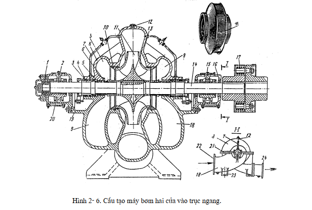 - BXCT Hai Cửa Vào: Thiết kế đặc trưng cho phép chất lỏng vào trung tâm từ cả hai phía. Gắn trên trục thép (14) và được cố định bằng đai ốc (4).
