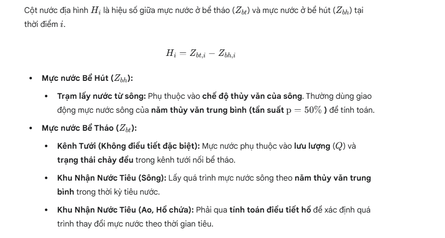 Việc xác định Cột Nước Địa Hình ($H_i$) là bước phức tạp nhất và yêu cầu kiến thức chuyên sâu về thủy văn và thủy lực công trình. Đối với trạm bơm lấy nước từ sông, dữ liệu năm thủy văn trung bình là bắt buộc. Đối với trạm bơm tiêu, phải làm rõ mục tiêu là tiêu triệt để hay tiêu có ngập để xác định mực nước bể hút. Khi sự giao động mực nước giữa bể hút và bể tháo nhỏ hơn $\mathbf{2 \text{ m}}$, có thể áp dụng công thức trung bình đơn giản để ước tính $H_{bqdh}$, tiết kiệm thời gian tính toán gia quyền phức tạp.