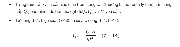 - Trong thực tế, kỹ sư cần xác định bơm công tác (thường là một bơm ly tâm) cần cung cấp $Q_p$ bao nhiêu để bơm tia đạt được $Q_e$ và $H$ yêu cầu.
