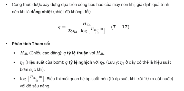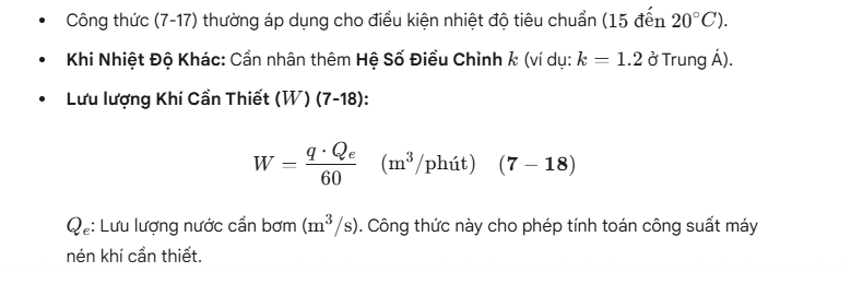 Tính Toán Tiêu Hao Khí Nén và Hiệu Suất Năng Lượng Của Bơm Sục Khí: Giải Mã Công Thức Suất Tiêu Hao Khí ($q$, Công Thức 7-17) Dựa Trên Chu Trình Đẳng Nhiệt và Hệ Số Điều Chỉnh Nhiệt Độ $k$; Phân Tích Công Thức Hiệu Suất $\eta$ và Đánh Giá Ảnh Hưởng Của Cột Nước Dâng $H_{\text{dh}}$ Đến Hiệu Suất Thấp ($\eta = 40\% \text{ đến } 59\%$) và Yêu Cầu Áp Suất Khí Nén $p$
