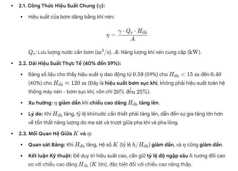 • Bảng số liệu cho thấy hiệu suất $\eta$ dao động từ $0.59$ (59%) cho $H_{\text{dh}} < 15 \text{ m}$ đến $0.40$ (40%) cho $H_{\text{dh}} \approx 120 \text{ m}$ (Đây là hiệu suất bơm sục khí, không phải hiệu suất toàn hệ thống máy nén – bơm sục khí, vốn chỉ $20\% \text{ đến } 25\%$).