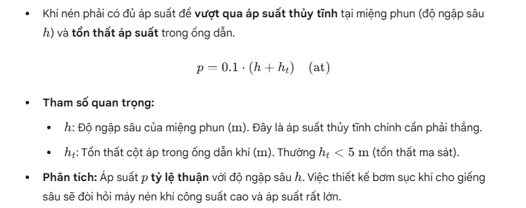• Phân tích: Áp suất $p$ tỷ lệ thuận với độ ngập sâu $h$. Việc thiết kế bơm sục khí cho giếng sâu sẽ đòi hỏi máy nén khí công suất cao và áp suất rất lớn.