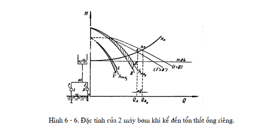 Bài viết chuyên sâu này sẽ tập trung vào phương pháp tối ưu hóa điểm công tác chung bằng cách kể đến tổn thất ống riêng ($h_{msr}$) (Hình 6-6). Chúng ta sẽ trình bày kỹ thuật trừ tung độ để hiệu chỉnh đường đặc tính của từng bơm thành phần, từ đó vẽ đường đặc tính chung hiệu chỉnh $(I + II)’$ chính xác. Đồng thời, chúng ta sẽ phân tích một yêu cầu an toàn quan trọng: kiểm tra công suất trục máy bơm ở chế độ làm việc riêng lẻ, đặc biệt đối với bơm ly tâm, để đảm bảo động cơ không bị quá tải.